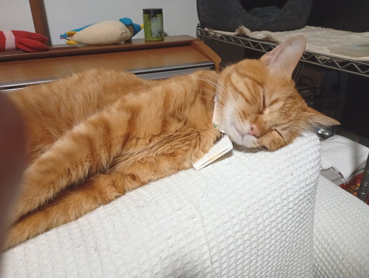 そんな中、“はな”おねぇちゃんは雨音も気にもせずに、エビとペンギンとサメをしたがわせソファーベットの背もたれで爆睡しているのでありました。(^^)/